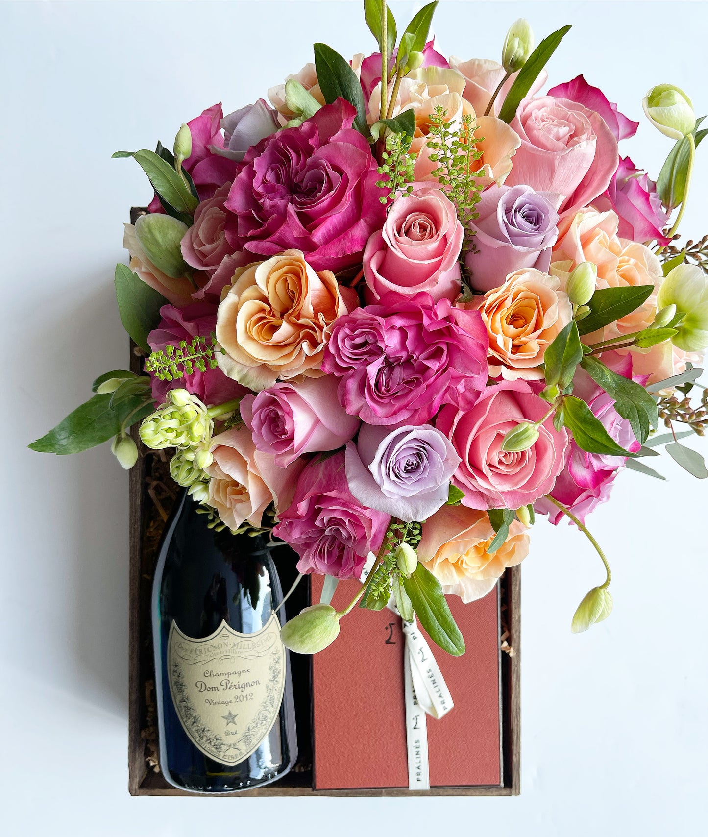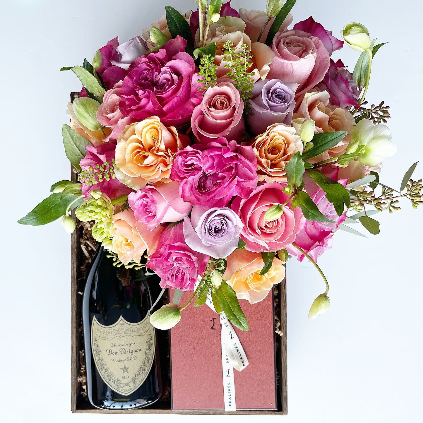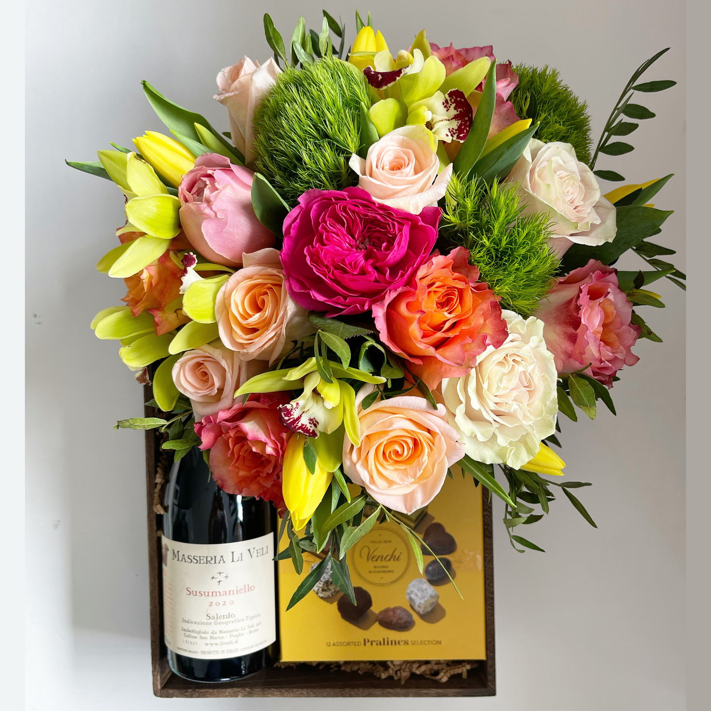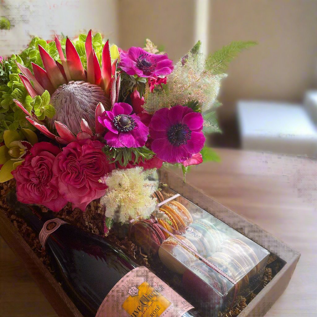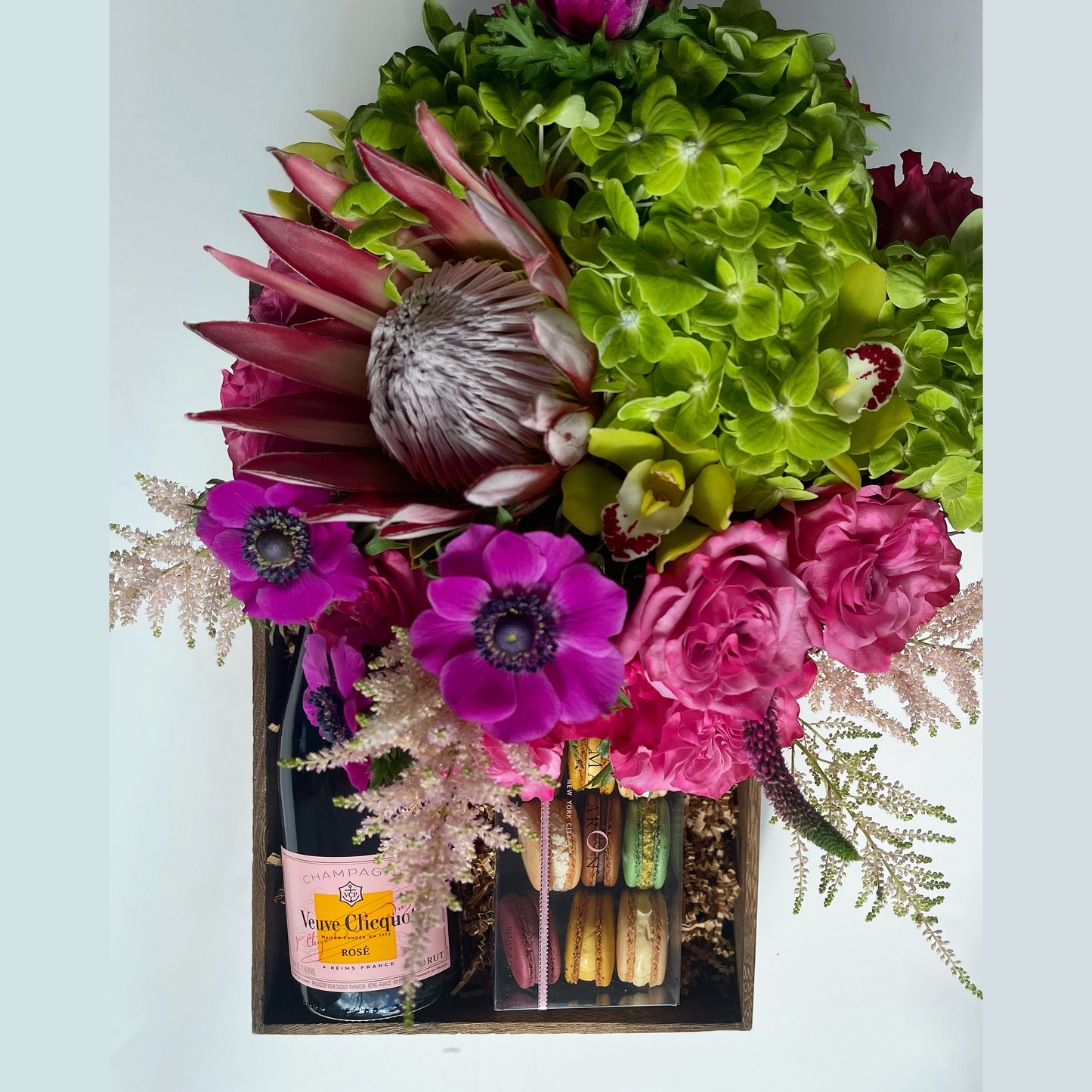 Beautiful flowers (roses, peonies, anemones, orchids, ranunculus) softly rustling and breathing with the freshness of the earth itself combined with crispy textures and delicate sweetness of variety of flavors macaroons (by Macaron cafe - vanilla, pistachio, coconut, raspberry, almond), luxury creamy filling, and exquisite taste of chocolates and truffles (la Maison du Chocolat or Venchi), stimulating all our senses (color, aroma, texture, flavor) irresistible and magical Champagne (Veuve Cliquot, Moet Chandon, Pommery, Tattinger, Pol Roger, Dom Perignon), smooth wine (Sancerre, Primitivo, Vermentino), delicate and elegant orchids, soothing gin, bourbon and whiskey, and soft and plush organic toy animals. Sight, smell, sound, touch, and taste. Isn't it the way we see the world around us? Immerse your beloved one in a little heaven on earth with our truly heavenly gift boxes.