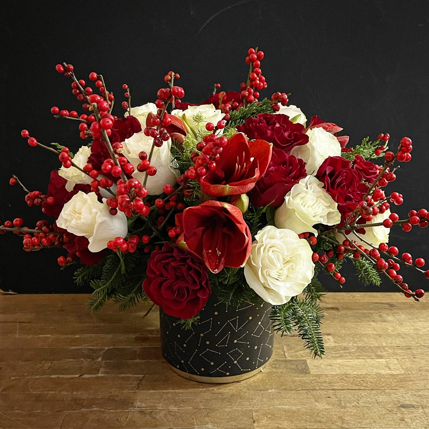 Experience the festive spirit with our Winter Berry Luxe Arrangement. This elegant centerpiece combines rich hues of crimson red with soft, warm whites and bold berry accents to create a look that is both classic and luxurious.
